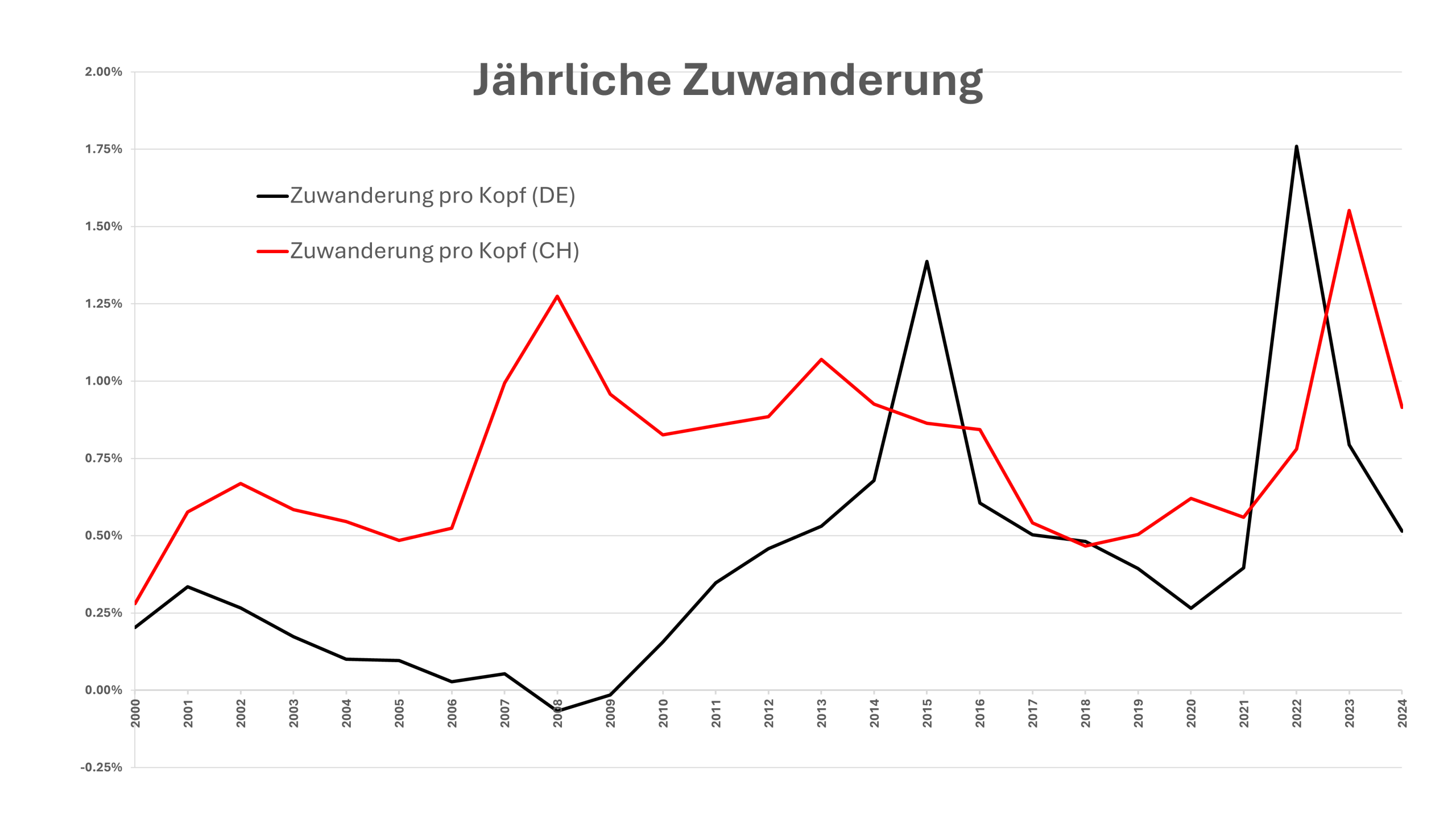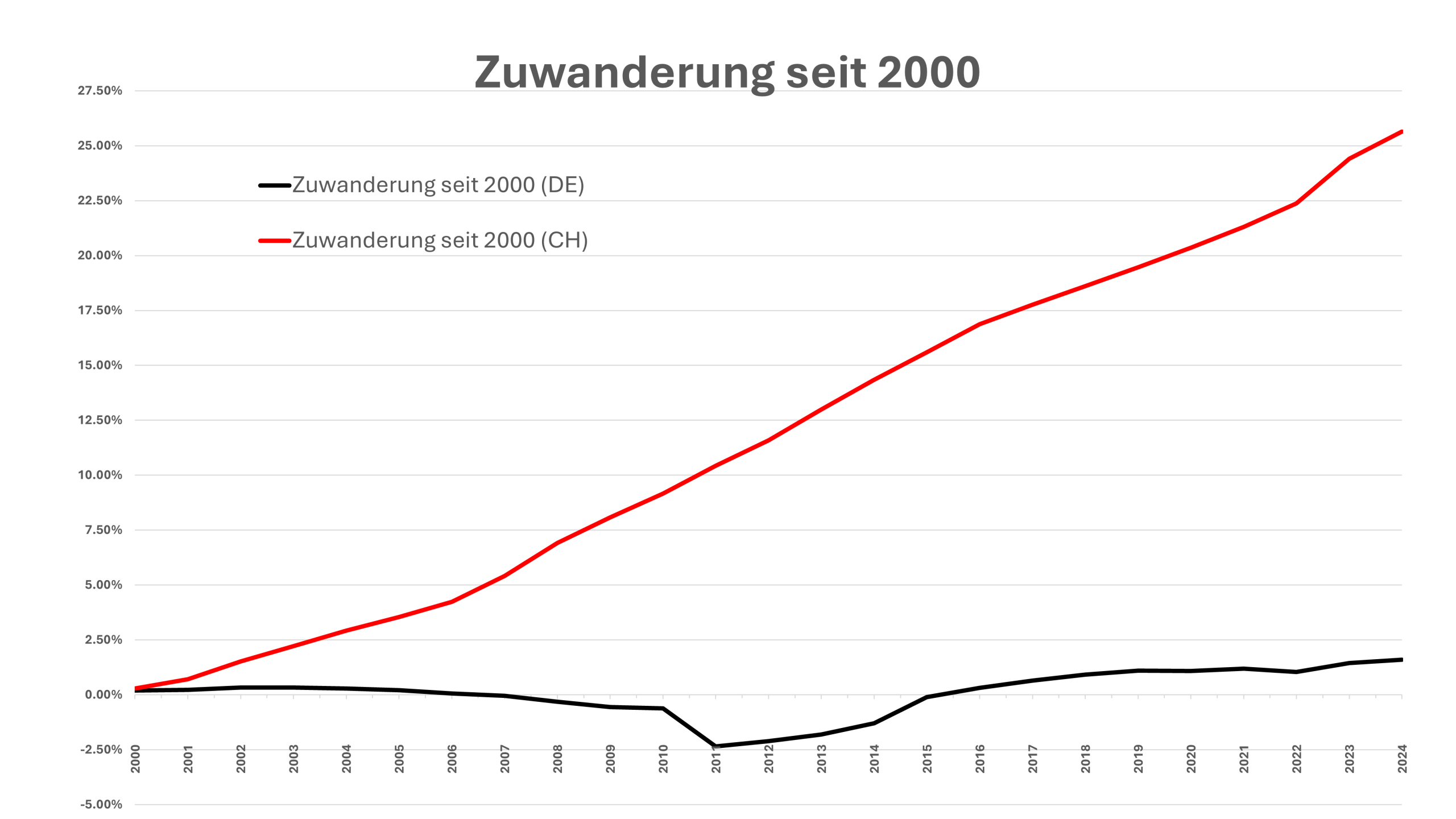 Die Schweiz hat pro Kopf die grösste Zuwanderung in Europa (pro Kopf 16x mehr als Deutschland).